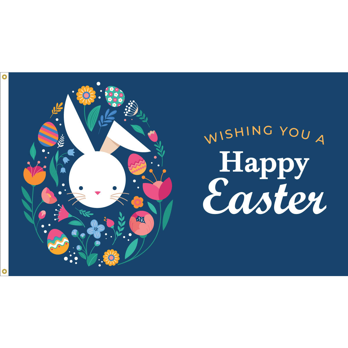 Celebrate the Easter holiday with this festive Easter Bunny Greeting outdoor nylon flag. This flag features a blue background and a Easter Egg adorned with florals with a cute butterfly in the center as well as a "Wishing You a Happy Easter" message. Made from 200 denier nylon fabric, this flag is fully printed and reads correct from the front and reverse from the backside. Finished with a strong polyester header and two brass grommets for easy attachment to your flagpole. Made in the USA.