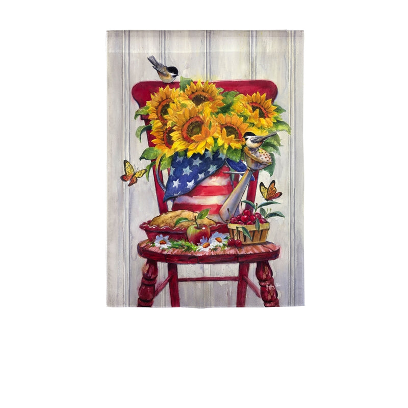 It's time to celebrate the Patriotic Summer with this American Sunflowers garden flag. Features a beautiful bouquet of Sunflowers with a patriotic vase, cheerful butterflies, bird, and an an all American pie perched on a red wood chair. Made from polyester-suede fabric, this garden flag has a unique textured design and is printed on both sides so reads correct from either direction. Fits any of our standard size garden flagpoles or hanging accessories and is an excellent choice for outdoor or indoor display. Measures 12.5"x18.