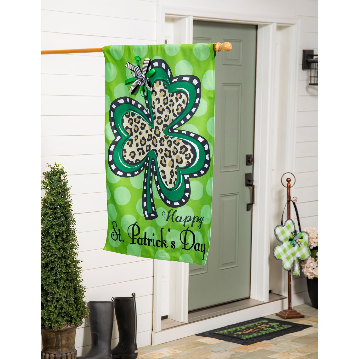 Get wild this St.Patrick's Day with our Animal Print Shamrock house flag. This flag features a green polka dot background with a leopard and checked patterned shamrock and a warm Happy St.Patrick's Day greeting. The design has both printed and appliqued construction, includes fun embellishments throughout, and is fabricated from on our burlap-polyester blend fabric. Designed for outdoor or indoor display. Fit any of our standard house flag poles and accessories. Measures 28"x44".
