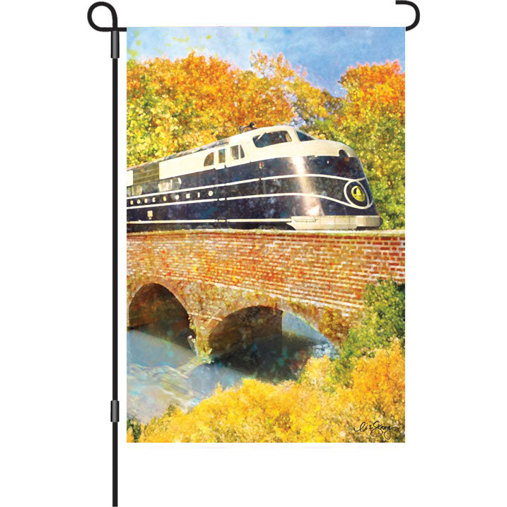 This B&O Autumn Train garden flag from Premier Designs is the perfect addition to your outdoor Fall home or garden decor. This miniature flag features a train crossing a bridge with the fall trees and leaves in the background. Made from outdoor polyester fabric, this printed flag is viewable from both sides. Fits any of our standard garden flagpoles and accessories. Measures 12"x18".