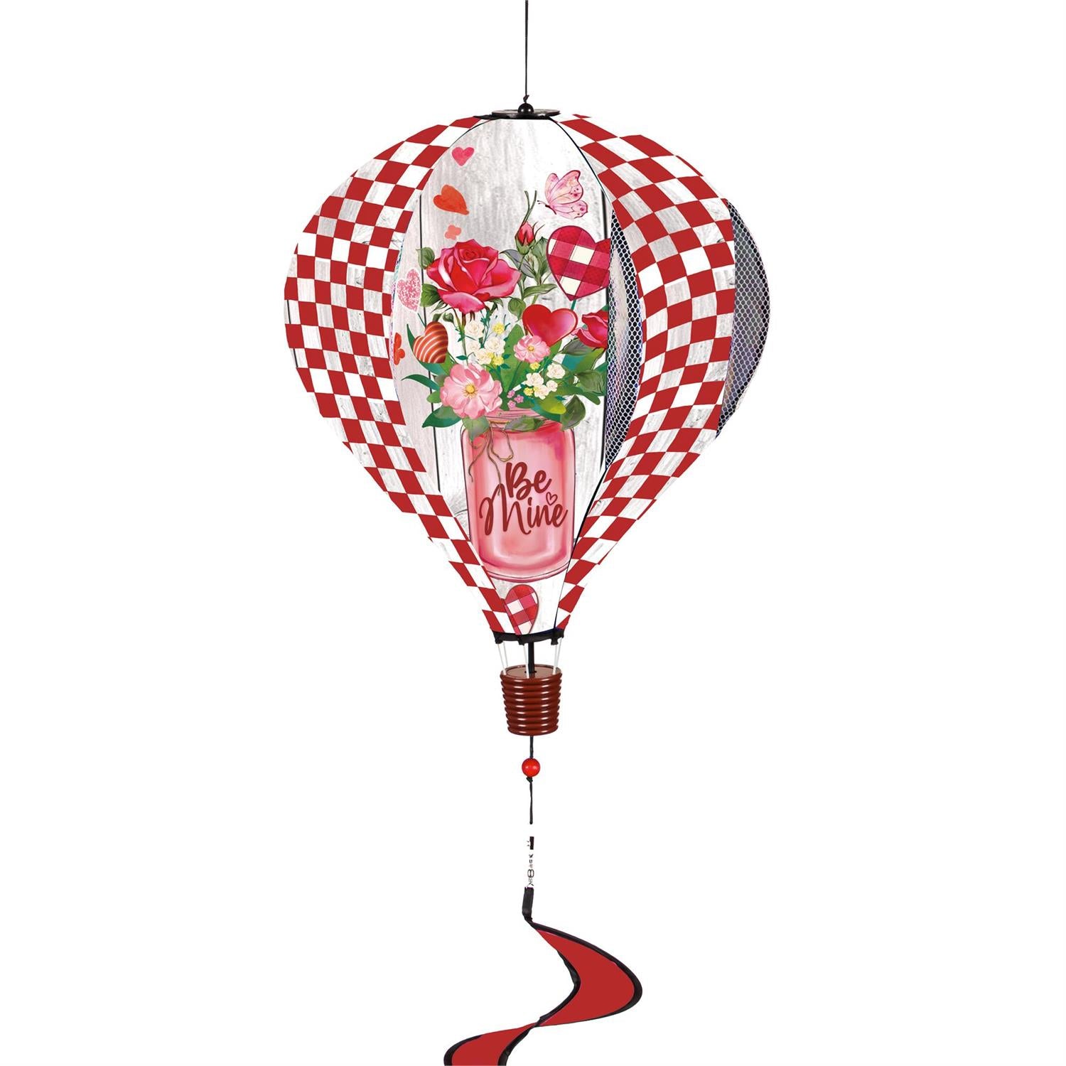 Add a little Valentine festivity with this Be Mine Mason Jar Hot Air Balloon Spinner windsock. This fun twirler features alternative panels with red and white checks and a floral filled vase with Valentine colored flowers and a "Be Mine" vase. This isn't your average windsock as this colorful balloon spinner has an a slightly open weave to help the air blow through to allow for a kaleidoscope display. Made with durable, weather-resistant polyester fabric, our balloon spinners have a spiral tail that keeps the design in motion as the wind passes through. Finished with a swivel hook at the top for easy attachment to a variety of attachment points including any of our windsock poles and accessories. Measures 15"ODx55"L.