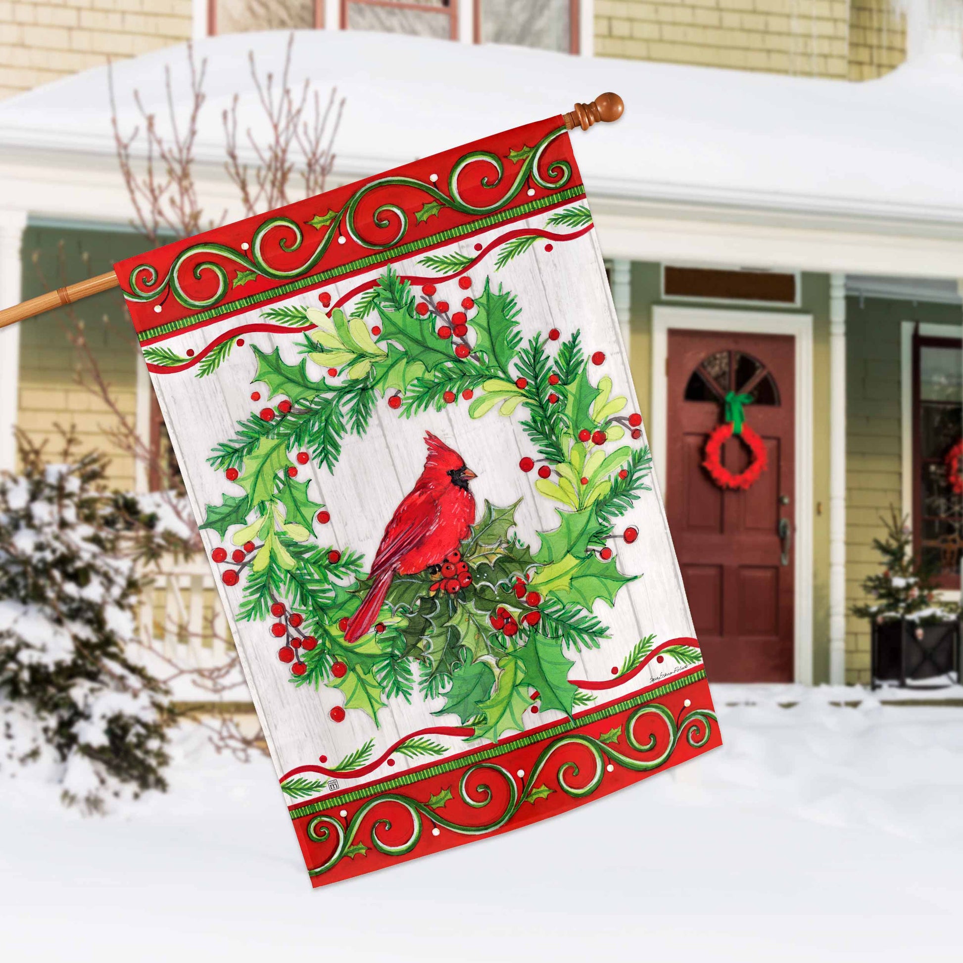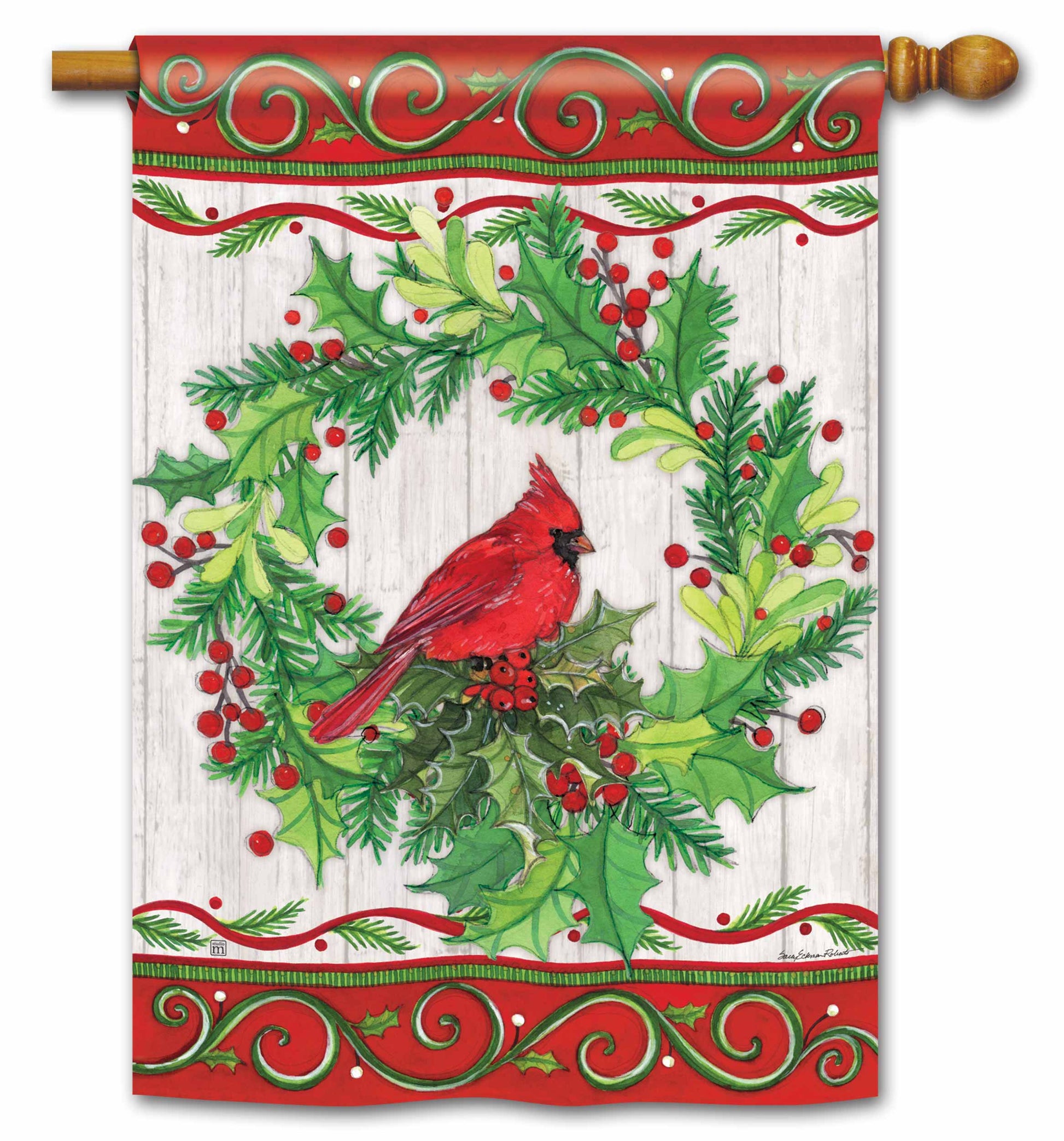 This Cardinal Joy house flag is a wonderful addition to your holiday and Winter decorations. This banner style flag features a shiplap style background with a wintery Christmas wreath filled with greens, holly, berries, and a perched cardinal. Made from polyester fabric, this printed flag reads correct from the front and reverse from the backside. Fits any of our standard house mounted flagpoles and accessories. Measures 28"x40".