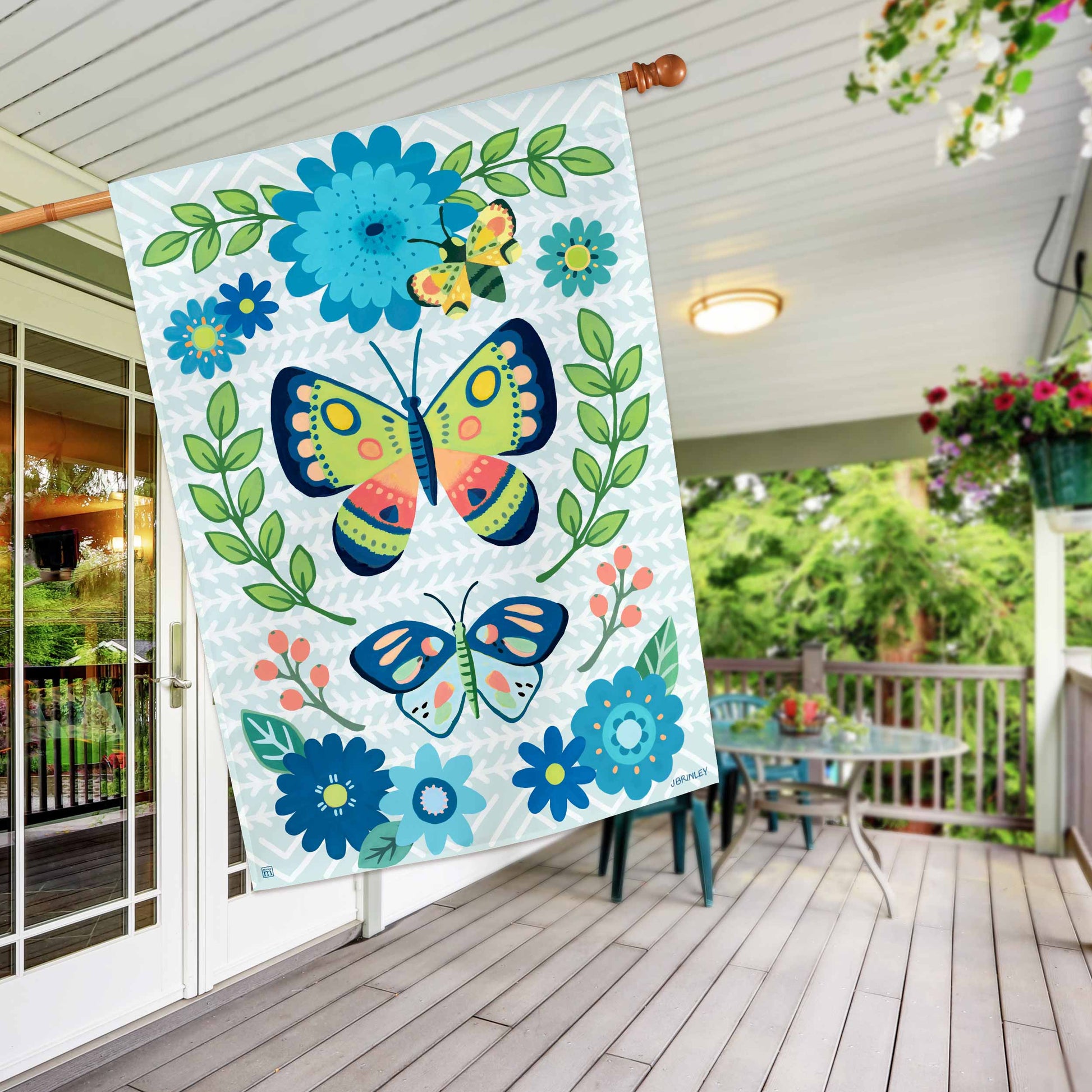 This Colorful Butterfly Wings house flag is the perfect addition to your home or garden this Spring or Summer. This banner style flag features a blue and white patterned background with a trio of colorful butterflies and blue green florals. Made from polyester fabric, this printed flag reads correct from the front and reverse from the backside. Fits any of our standard house mounted flagpoles and accessories. Measures 28"x40".