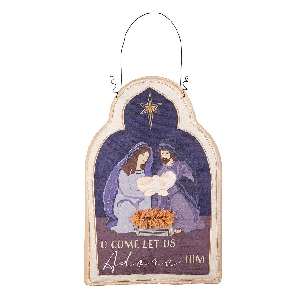 Celebrate the reason for the season with this Come Let Us Adore Him estate door decor hanger. Made from a polyester-burlap blend fabric, this Christmas decoration features Mary and Joseph in with baby Jesus and the words "O Come Let Us Adore Him". Door hangers are the perfect addition to spruce up your door, office, empty wall, or can be displayed on any of door decor hangers or stands. Measures 26"Lx17"W.