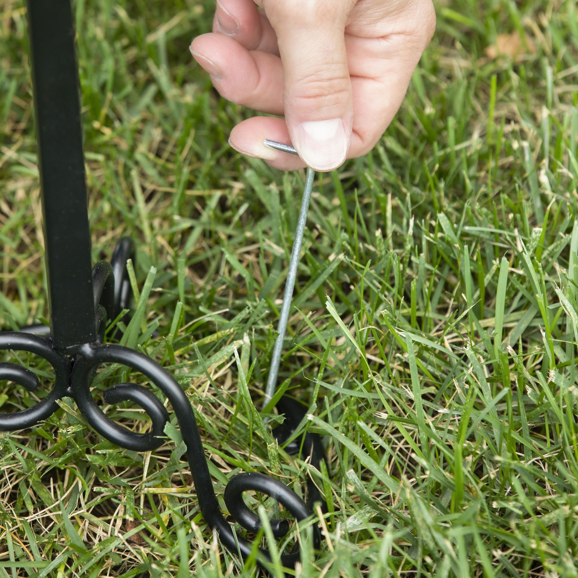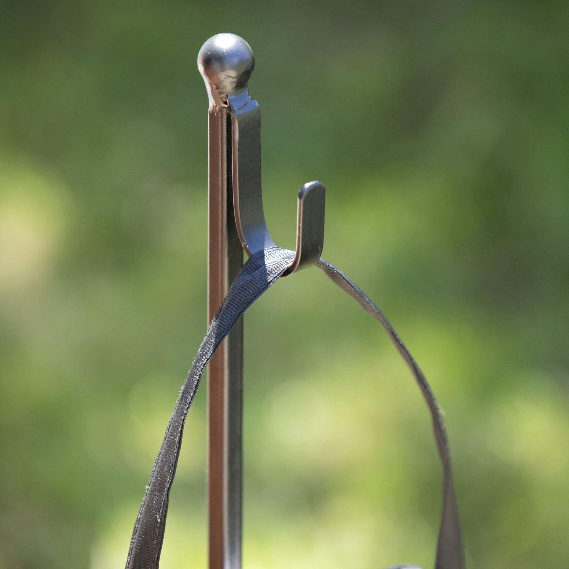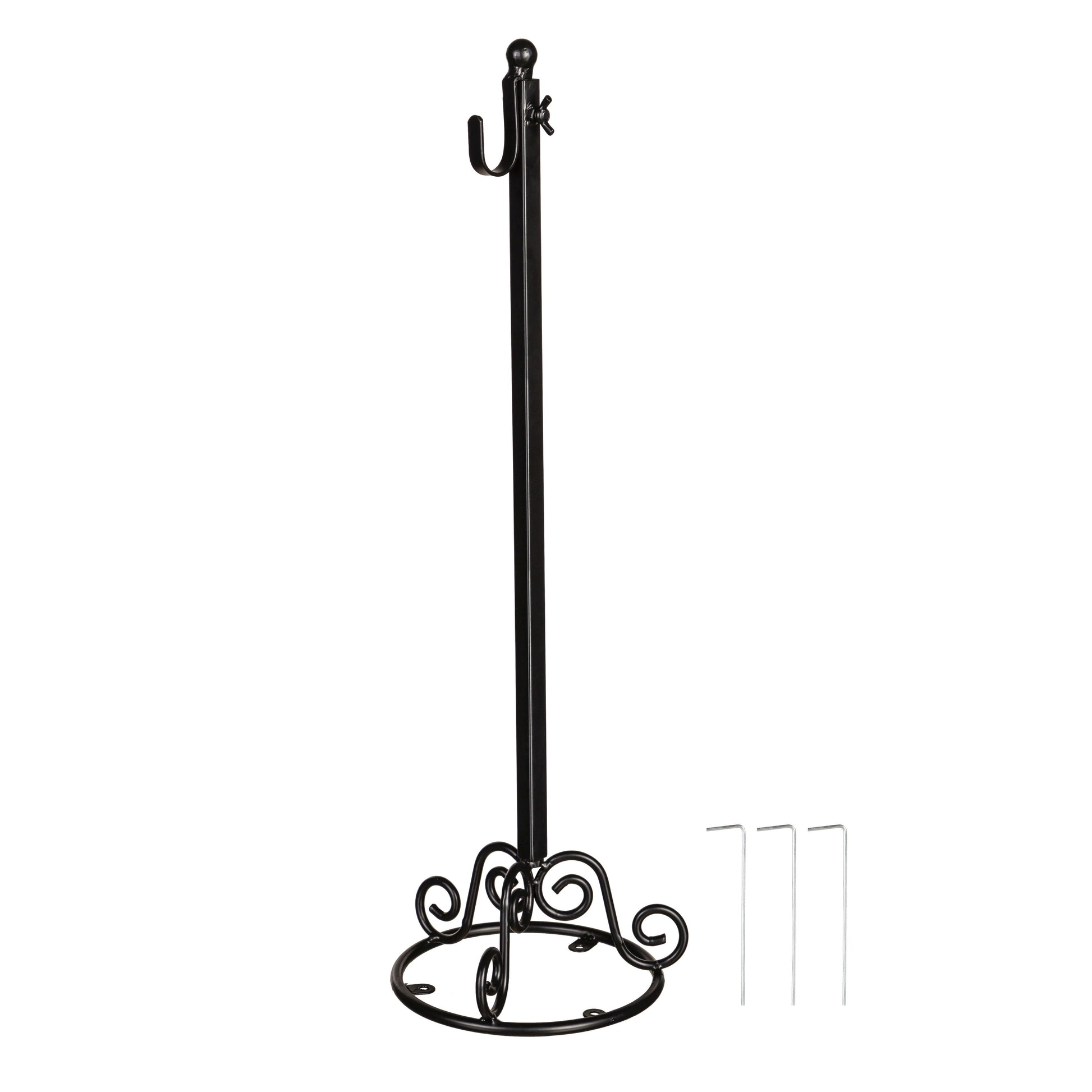 Looking to add a little inspiration to your home this holiday season, add our decorative bronze metal door decor hanger stand to display your favorite door hangers. Made from metal, this stand is finished with a decorative top, square base, and two swirly hooks for easy attachment to your door decor straps. Includes ground stakes so it can be used on a flat surface such as a sidewalk or entryway or can also be used on a soft surface such as grass with the lawn stakes. It's a great way to display door hangers by your front door, fireplace, or any space that needs a little seasonal inspiration. Measures 6.42"ODx42"T