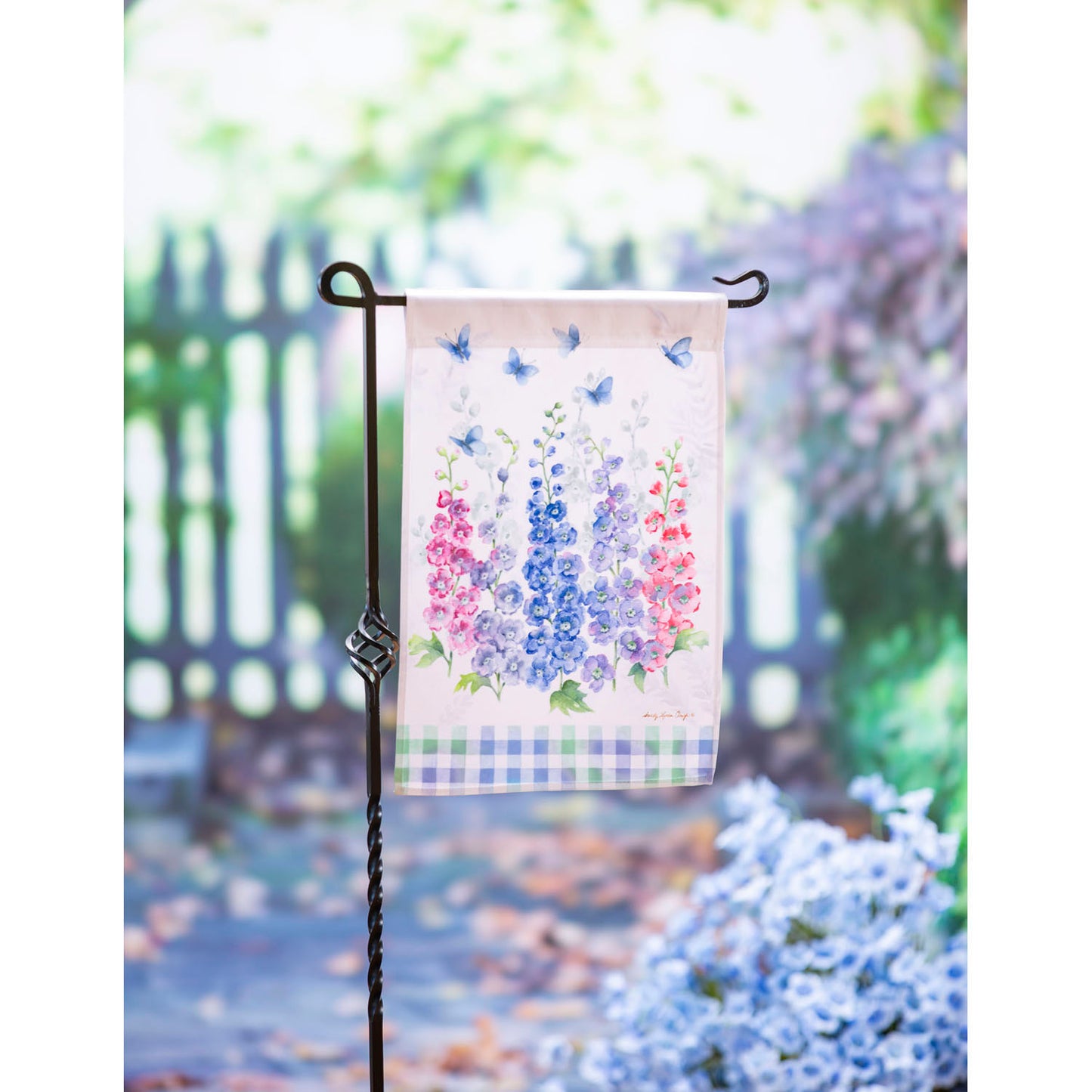 This beautiful Delphiniums garden flag features pink, blue and lilac florals with flittering blue butterflies. Printed on polyester fabric, this mini flag reads correct from the front and reverse from the backside. Fits any of our standard size garden flag poles and accessories and is an excellent choice for outdoor display. Measures 12.5"x18".