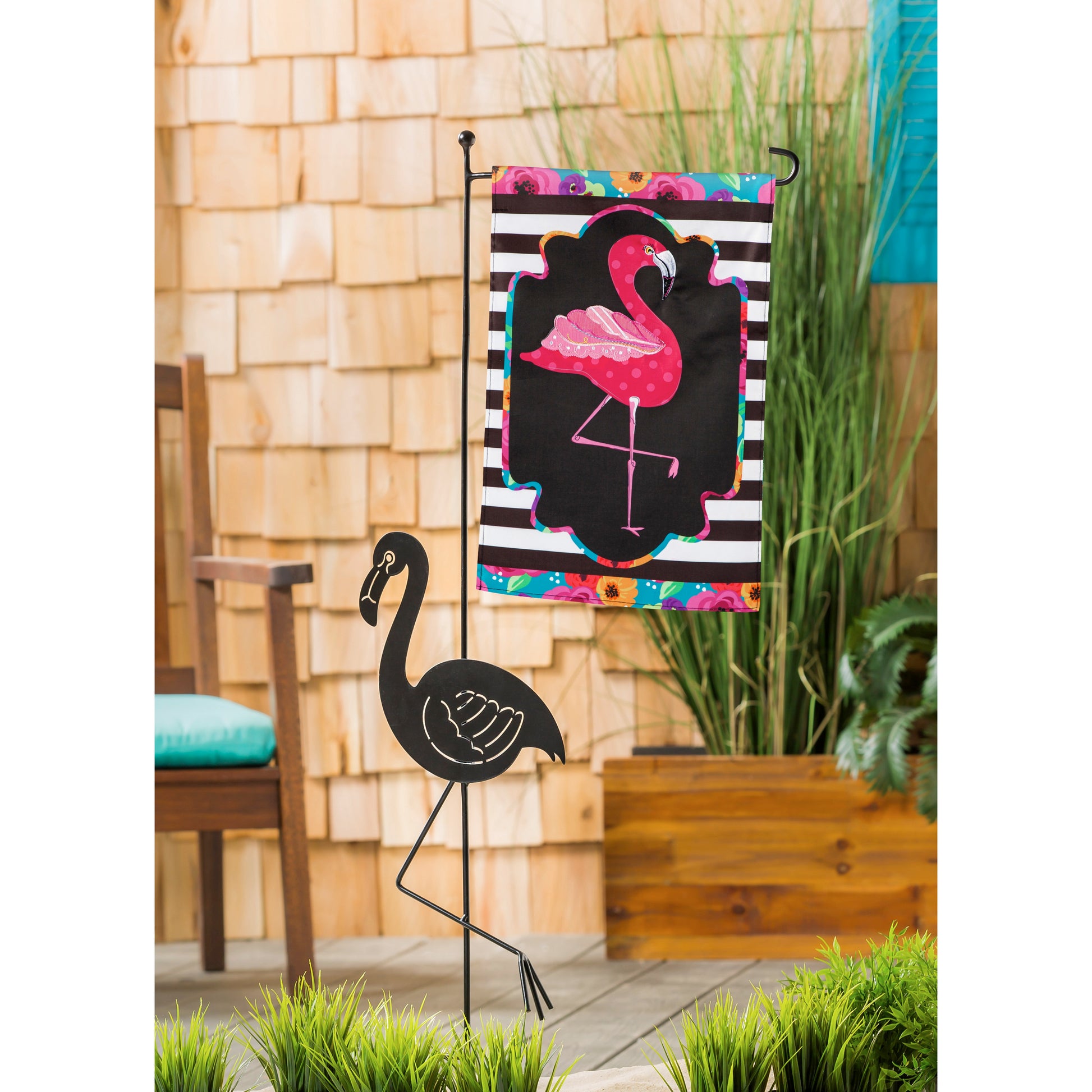 Flamingo Stripes and Flowers Applique Garden Flag; Polyester 12.5"x18"