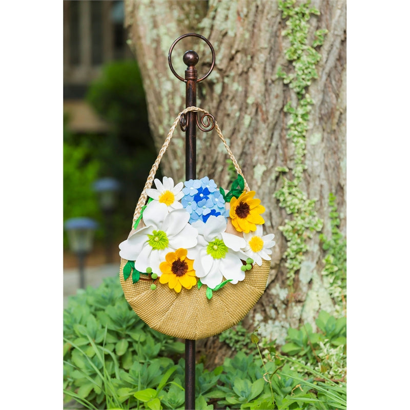 Adorn your home or garden this Spring or Summer with this Flower Basket door hanger. Made from a polyester-burlap blend material, this floral decoration is designed for outdoor or indoor display and features a basket full of flowers including daisies, sunflowers, and hydrangeas, in a woven style basket. Door hangers are the perfect choice for hanging on an exterior or interior door, office wall, eye hook, or a variety of other hanging methods. You can also display on any of our door decor hangers or stands. Measures 14.5"L x 14.5"W.