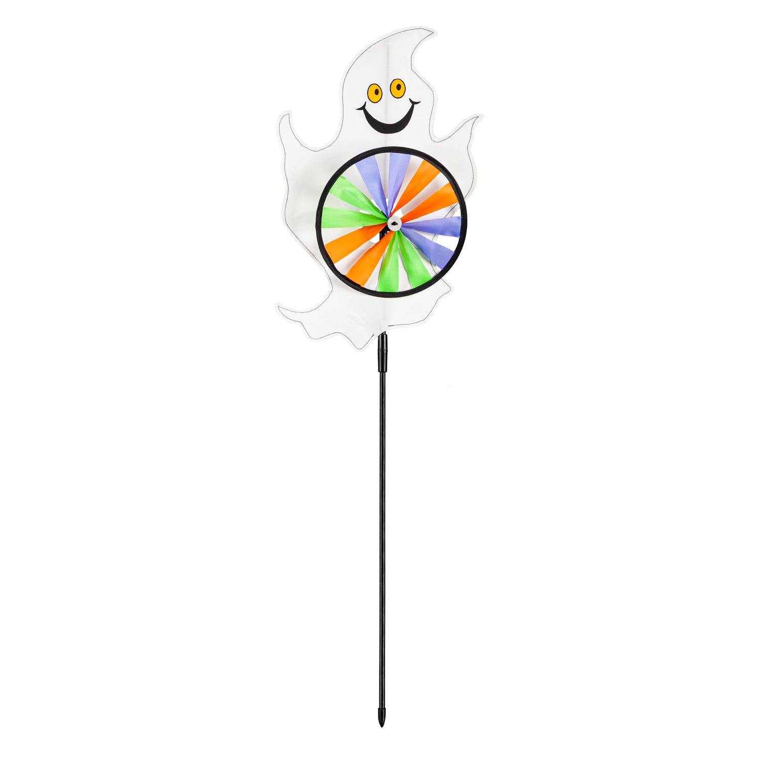Simple pinwheel spinner featuring a smiling ghost on an included sectional pole.