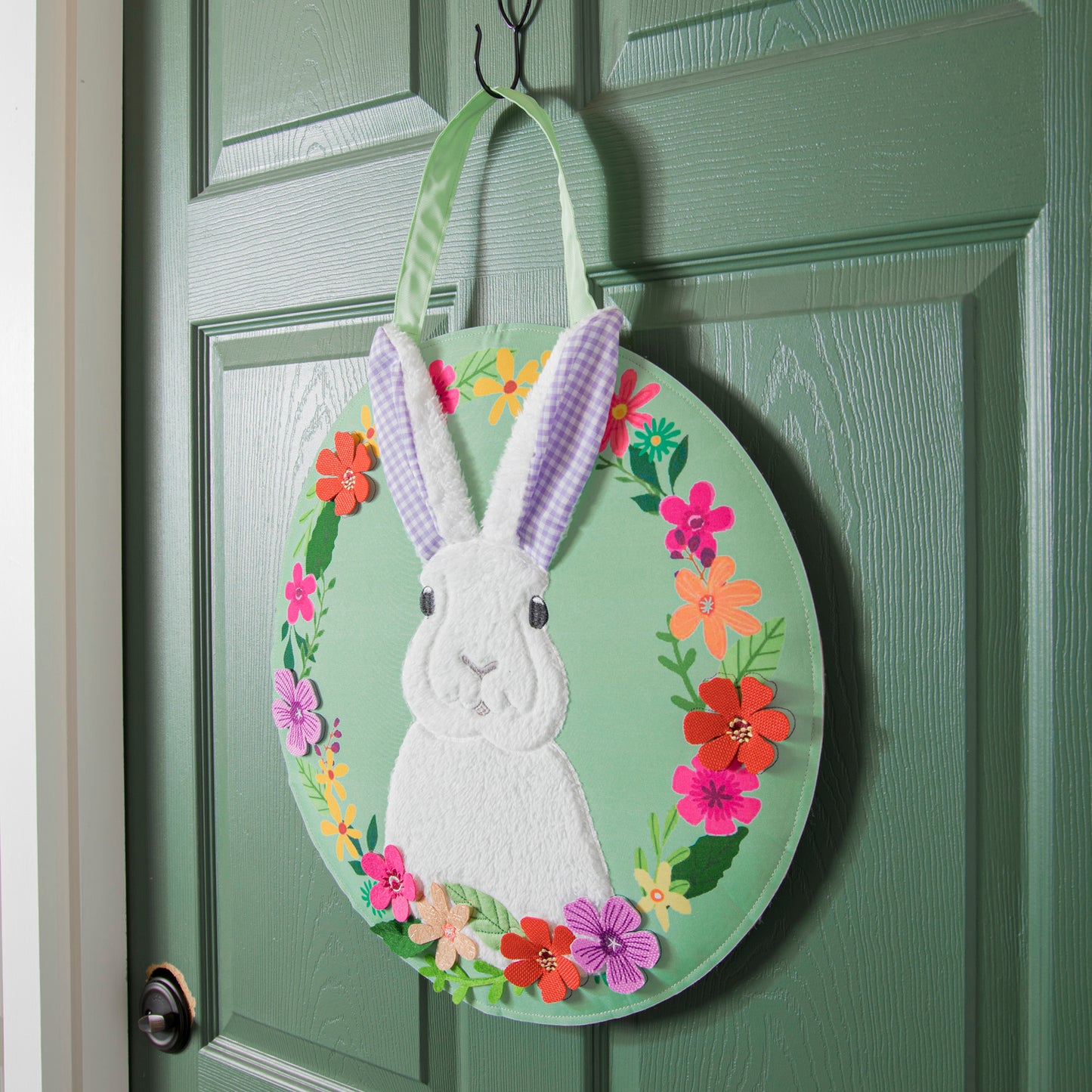 Add a touch of fun to your home or garden with this Gingham Bunny door decor hanger. Made from a polyester-burlap fabric blend, this colorful bunny is an excellent choice for an everyday, Spring, Summer, or Easter decoration for your home. Features a green circular background with a floral border and an adorable bunny with gingham ears in the middle. Hang on any of our door hanger holders or door decor stand. Measures 18"x18".