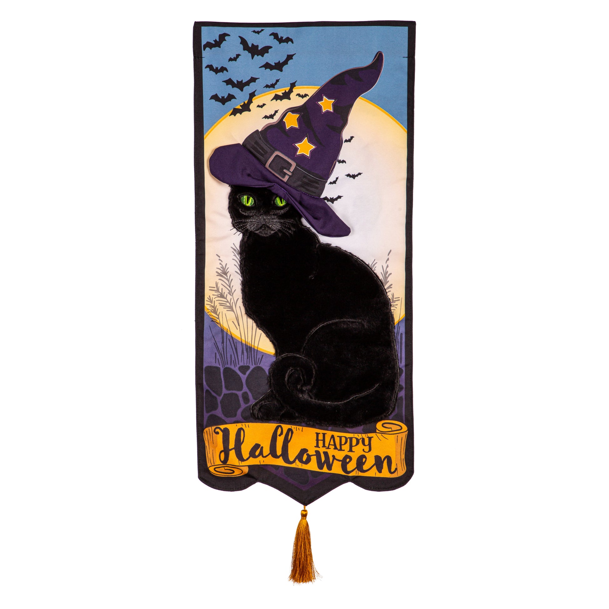 Welcome trick or treaters to your home this year with this Happy Halloween Black Cat garden flag. Features a Halloween scene background with a large full moon and flittering bats, a watchful black cat wearing a witch hat, and a "Happy Halloween" greeting. Our Everlasting Impression collection is made with our polyester-linen blend material. This unique double-sided garden flag has printed, applique, and embellished components and flag reads correct from both sides. Fits all of our standard size garden flagpoles and hanging accessories. Measures 12.5"x28".