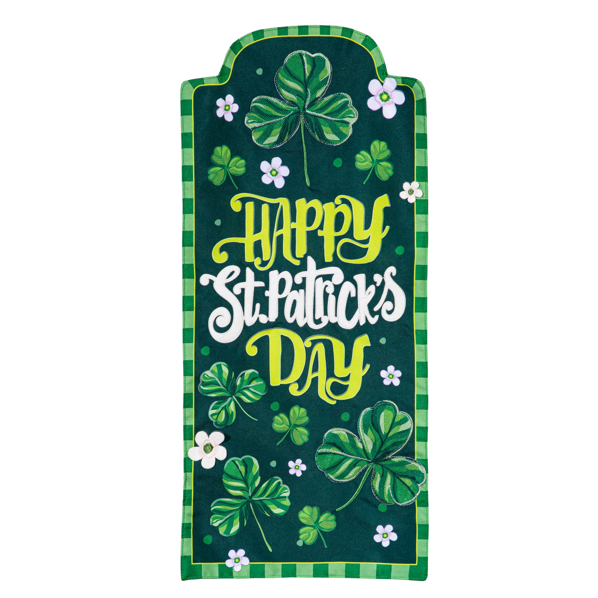 Spread a little Spring cheer with this Happy St Patrick's Day Shamrocks garden flag. This festive flag features a striped border with a dark green centered background, medley of shamrocks flowers and polka dots, and a "Happy Saint Patrick's Day" greeting. Our Everlasting Impression collection is made with our polyester-linen blend material. This unique double-sided garden flag has printed, applique, and embellished components and flag reads correct from both sides. Fits all of our standard size garden flagpoles and hanging accessories. Measures 12.5"x28".