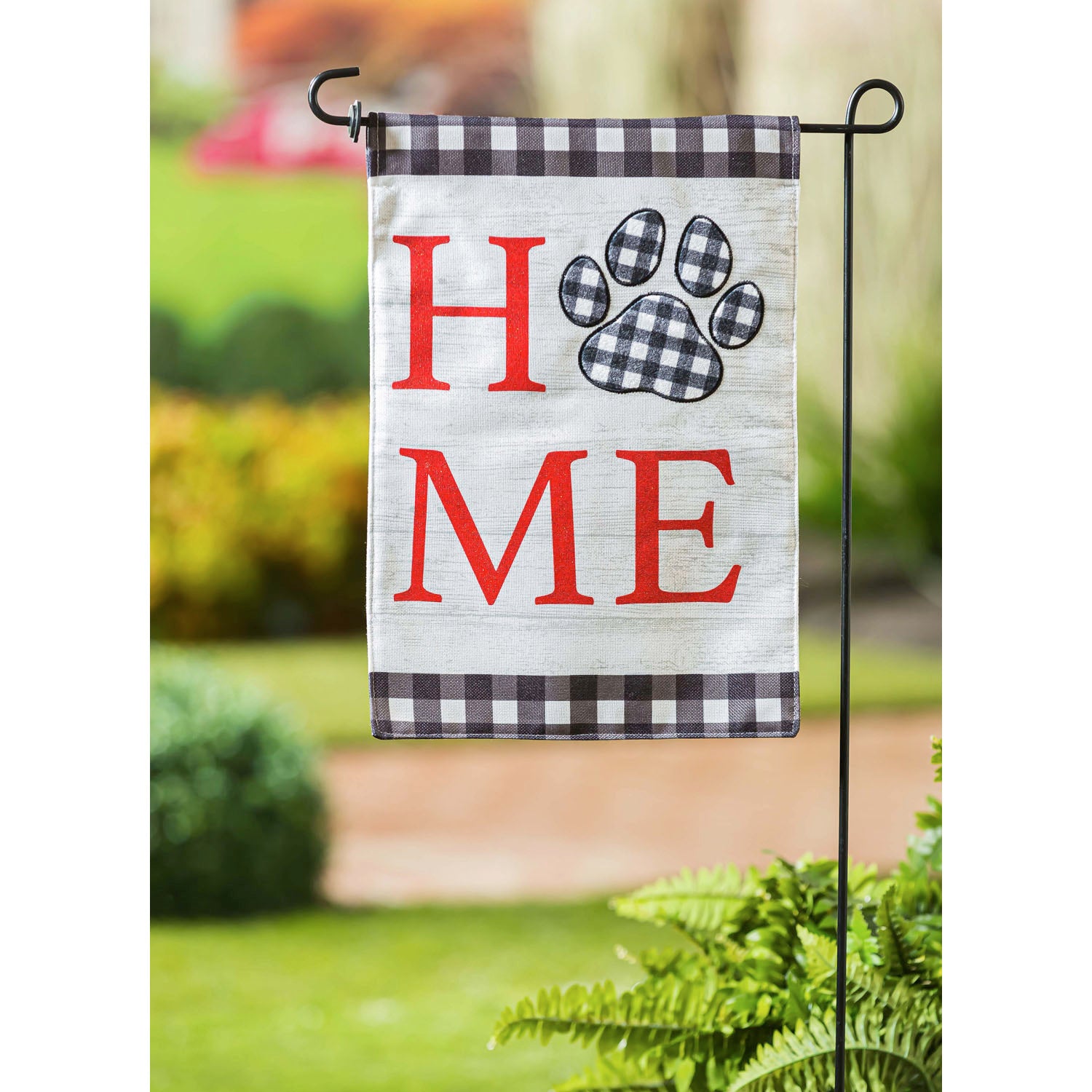 Nothing says home for the dog lover than this adorable burlap garden flag.  It features a black and white gingham plaid top and bottom border and a coordinating paw print. Made with our polyester-burlap blend material, it's an excellent choice for for displaying outdoors. This double sided design reads correct from both sides and fits any of our standard garden flagpoles or accessories. Measures 12.5"x18".