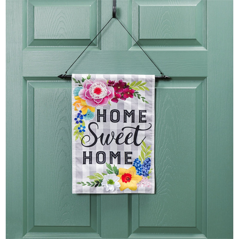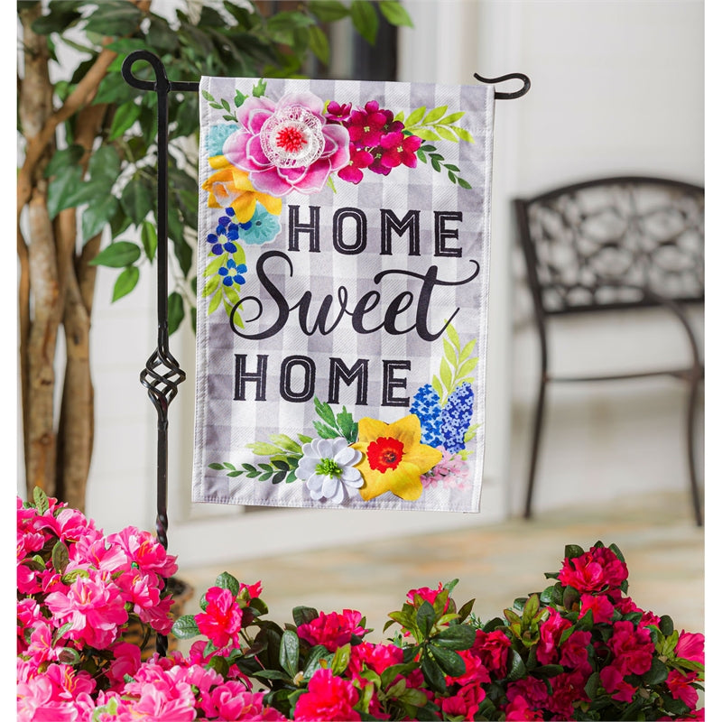 Welcome your family home to your house with this Home Sweet Home Plaid Floral garden flag. Features a neutral plaid background with pretty florals and the message "Home Sweet Home. This mini flag is made with a polyester-linen blend fabric, is double sided and features printed construction with fun added embellishments throughout. Fits any of our standard size garden flag poles or accessories and is a great option for Spring or Summer display. Measures 12.5"x18".