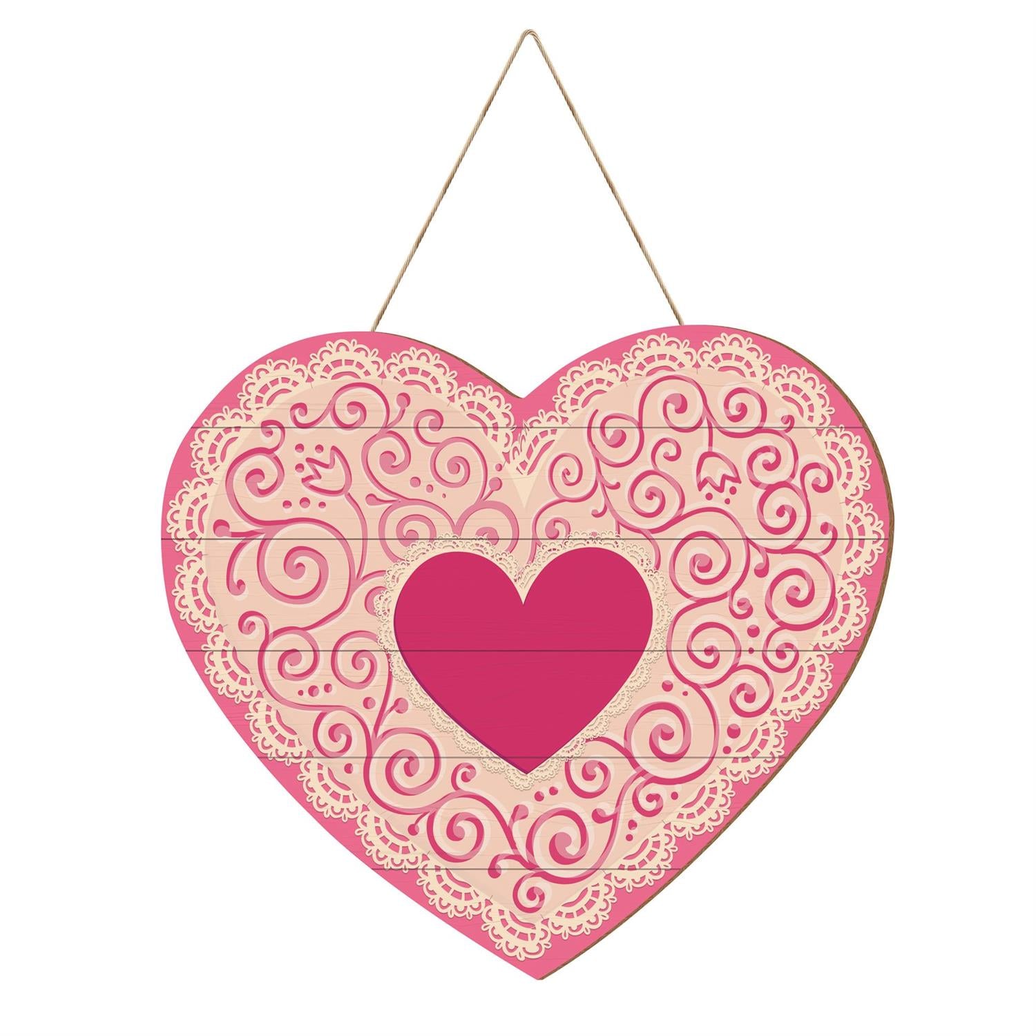 Celebrate Valentine's Day or any day with this Laced Heart Be Mine door hanger. This sweet door decoration features an artistic heart. Made from wooden, this hanger will lay flag against any door, wall, or flat surface and includes a burlap string for easy hanging display. Measures 16.25"Lx18"W