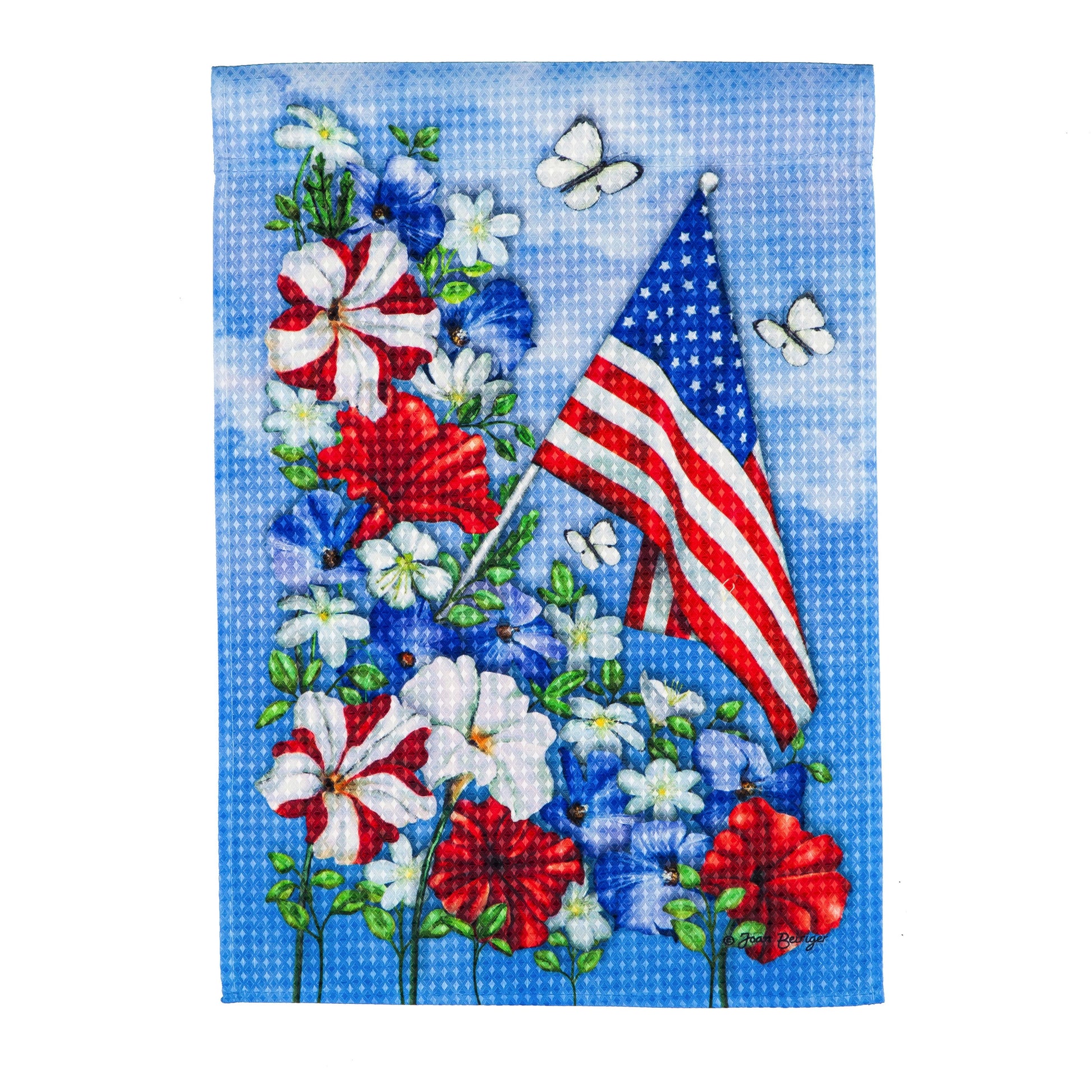 Add a little red, white, and blue to your home or garden with this Patriotic Garden garden flag. Features a medley of patriotic florals, an American flag, butterflies, and a blue sky background Made from polyester fabric, this garden flag has a unique printed waffle textured design and is viewable from either side. Fits any of our standard size garden flagpoles or hanging accessories and is an excellent choice for outdoor or indoor display. Measures 12.5"x18.