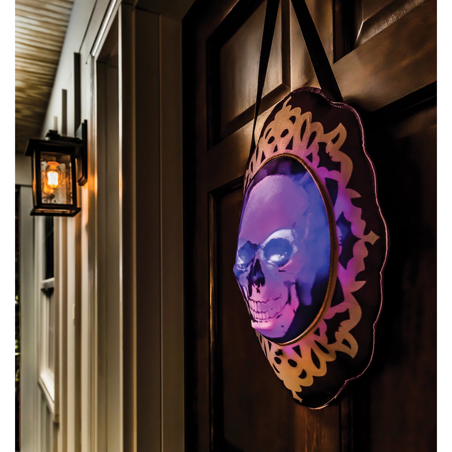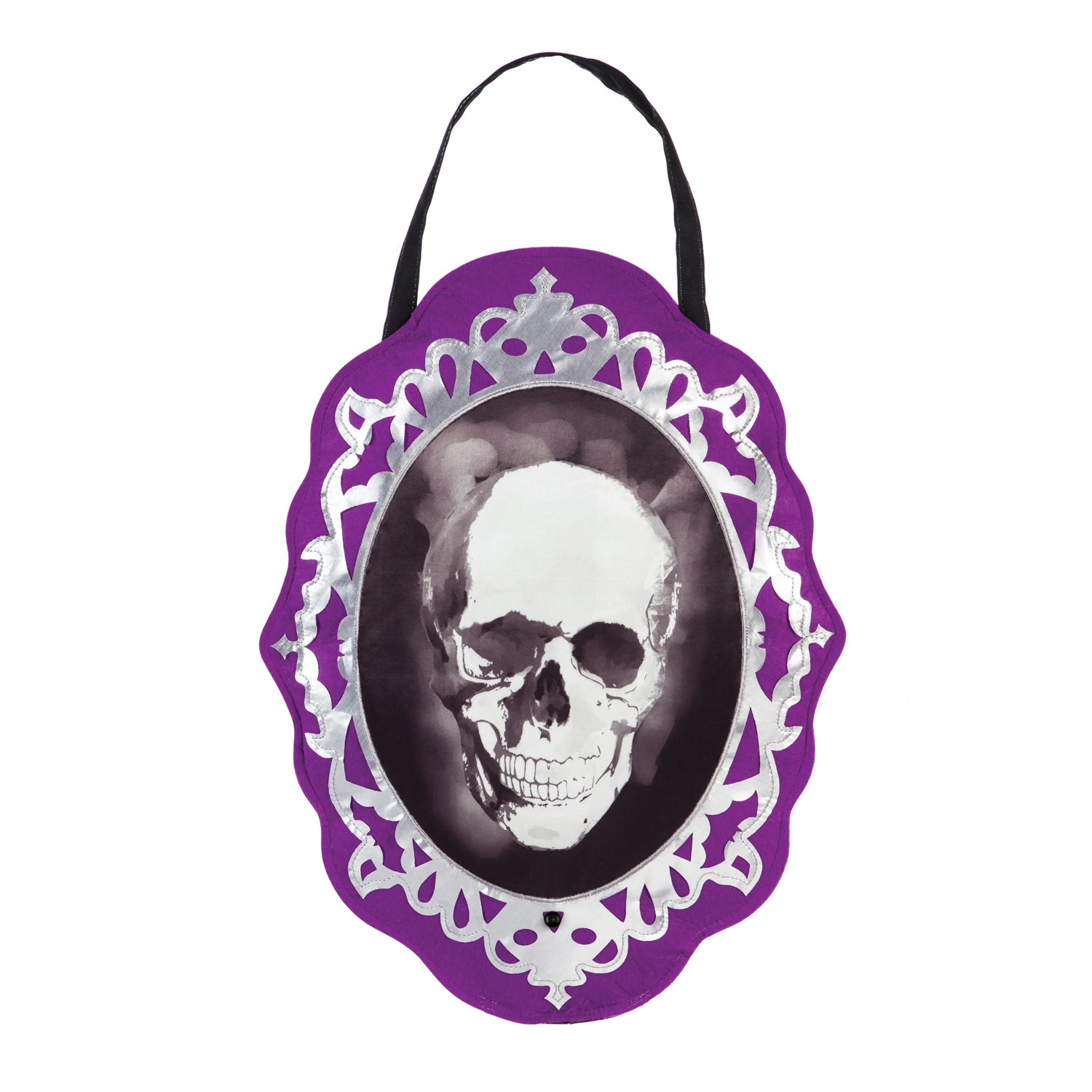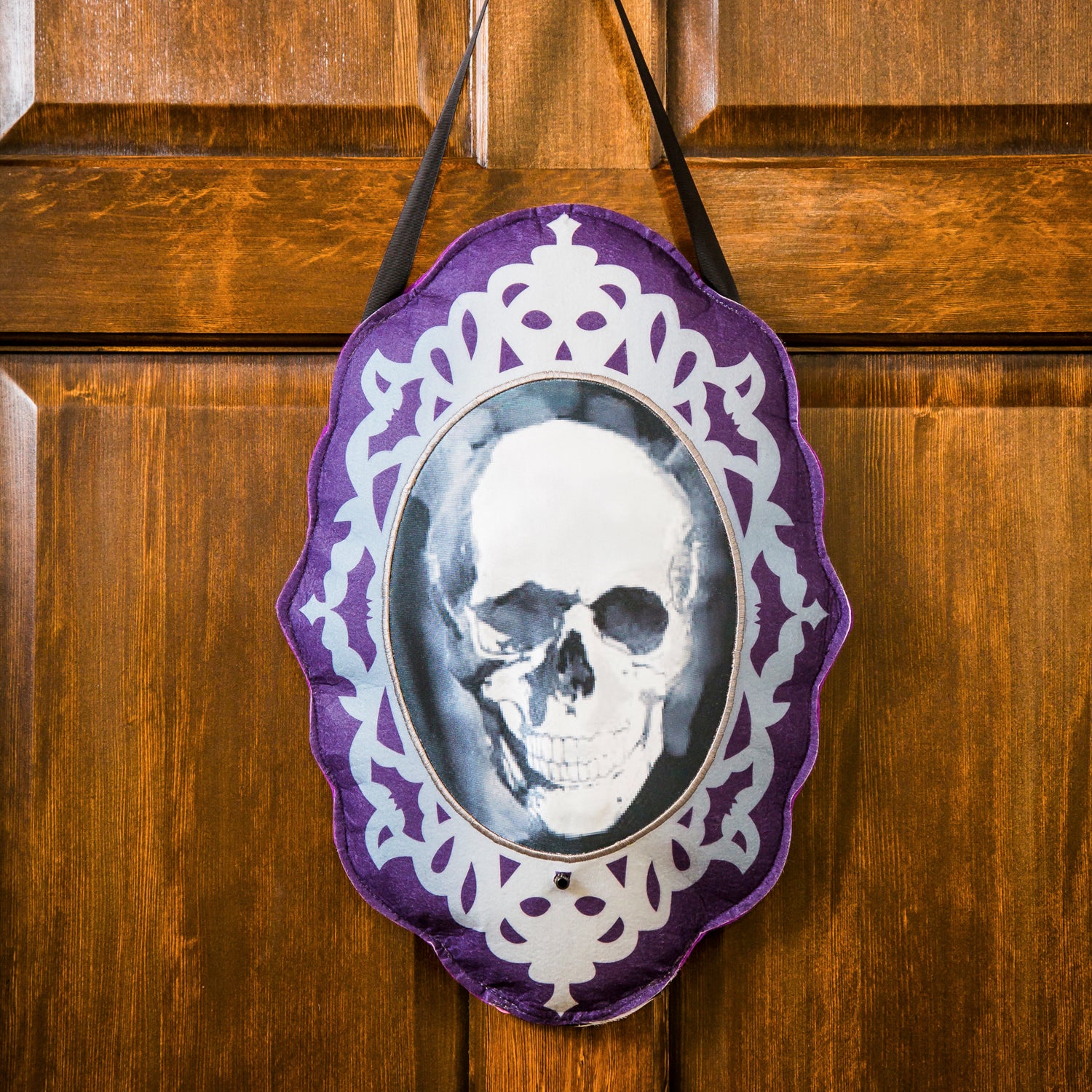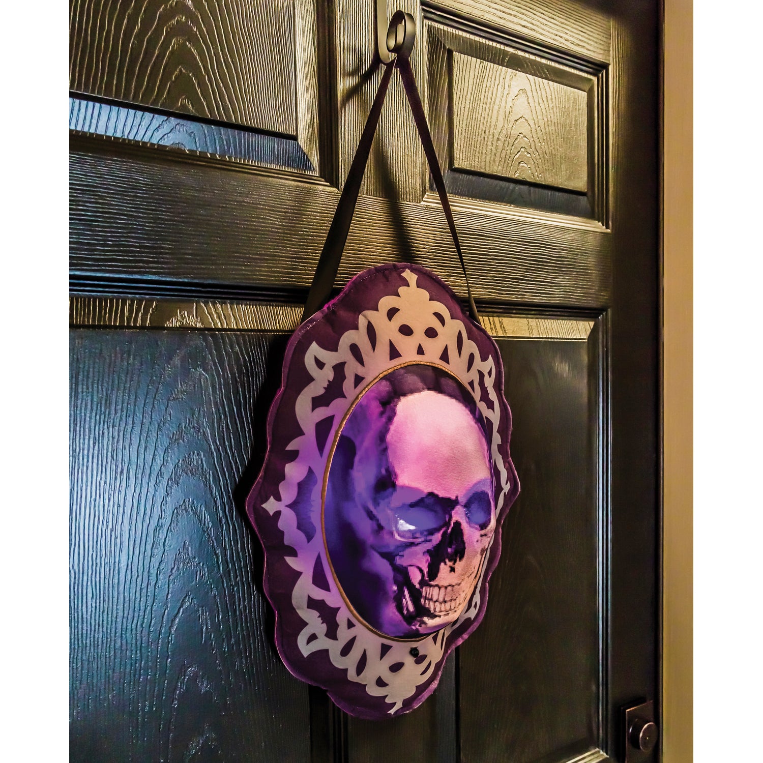 Add this spooky Skull Motion door hanger to your Halloween decorations this year. Made from a polyester-burlap blend fabric, this outdoor door hanger lights are activated by motion so are sure to be a fun little trick for your trick or treaters this Halloween. Measures 21"Lx16"W.