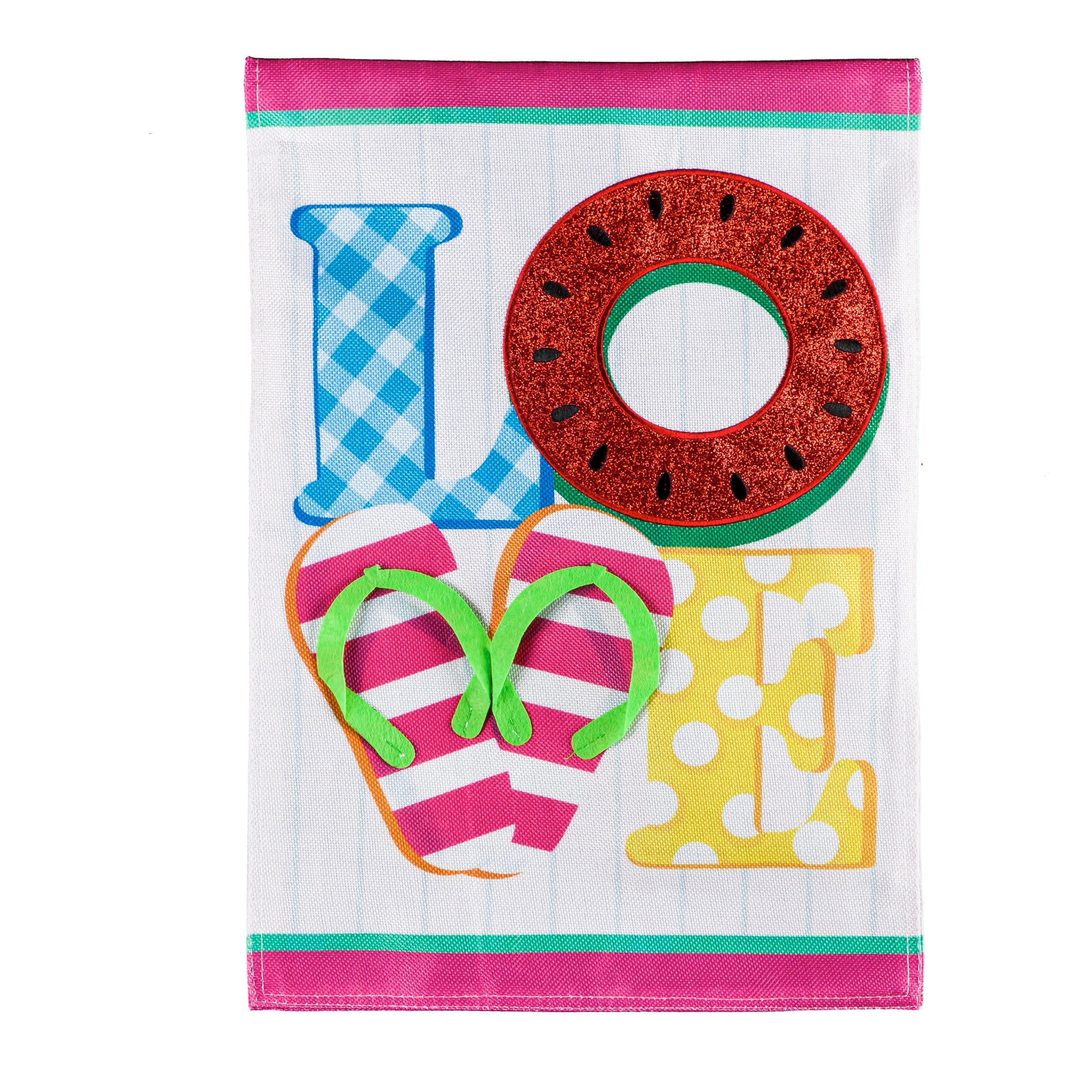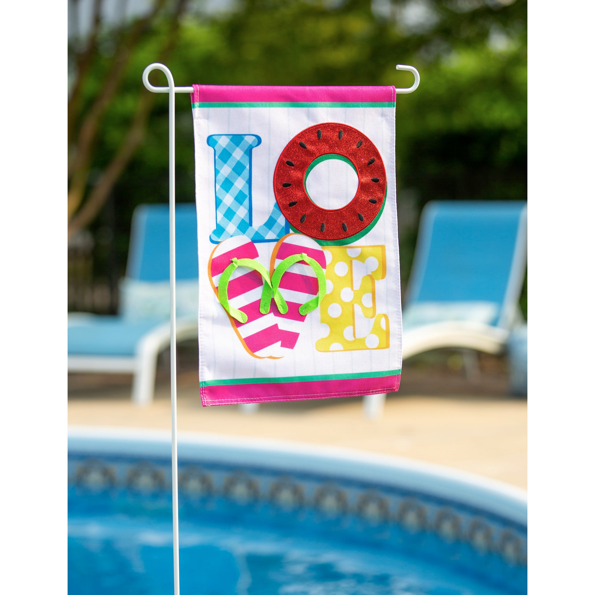 Celebrate the best part of Summer with this fun and colorful Summer Love garden flag. This flag features a the word "LOVE" with a watermelon shaped floaty, flip flops, and bright cheery colors. The design is printed and includes fun embellishments throughout and is fabricated from on our burlap-polyester blend fabric. Designed for outdoor or indoor display. Fit any of our standard garden flag poles and accessories. Measures 12.5"x18".