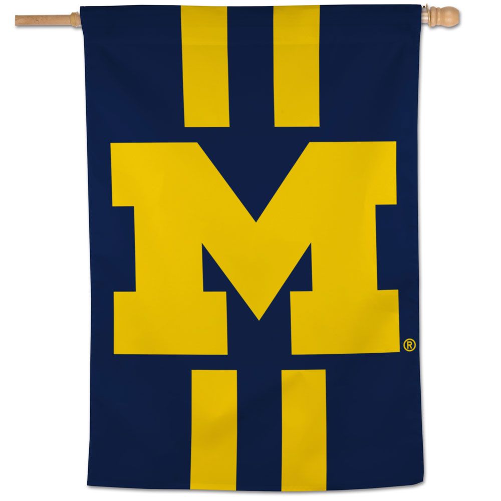 Cheer on your University of Michigan Wolverines with this 28"x40" house flag, featuring the Michigan logo in yellow on a striped dark blue background. Made from polyester material, this printed team flag is single-reverse so it reads correctly on the front and reversed on the back side.  It is an excellent choice for flying from a house mounted flagpole and is finished with a sleeve and tab for easy attachment to your pole. Officially Licensed.