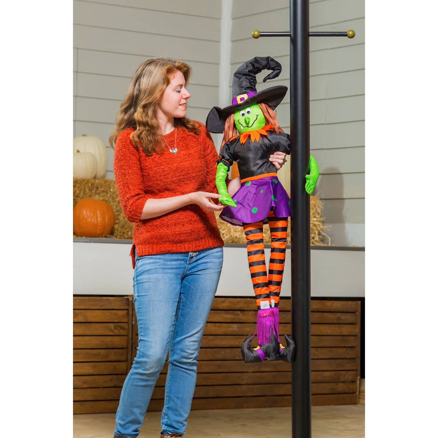 Decorate your home this Halloween with this and festive Wicked Witch post hugger decoration. This flexible post hugger is made of out outdoor nylon fabric and is shaped like a witch. Includes hook-and-loop fastener to secure the limbs in place to your post, column, railing, etc. Measures 43"Tx11"W.